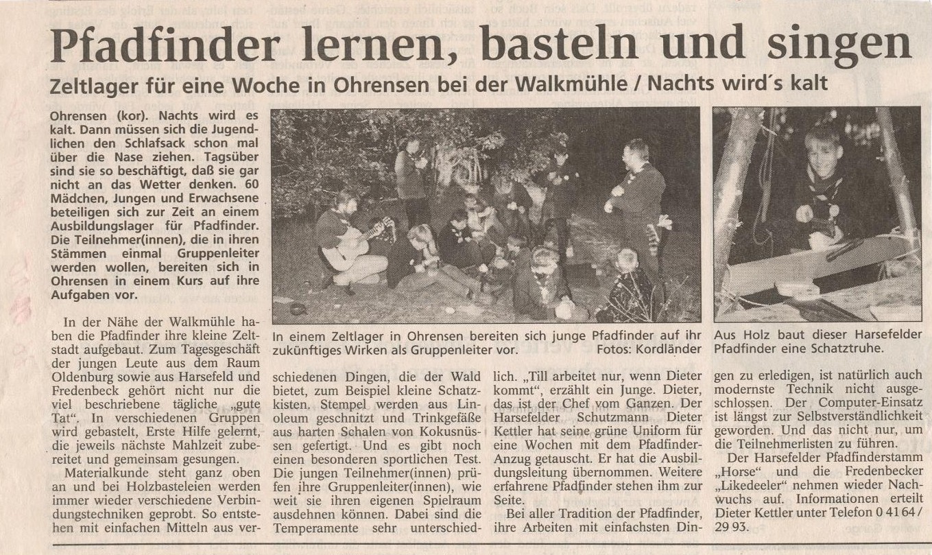In der Nähe der Walkmühle haben die Pfadfinder ihre kleine ZeltStadt aufgebaut. Zum Tagesgeschäft der jungen Leute aus dem Raum Oldenburg sowie aus Harsefeld und Fredenbeck gehört nicht nur die viel beschriebene tägliche „gute Tat". In verschiedenen Gruppen wird gebastelt, Erste Hilfe gelernt, die jeweils nächste Mahlzeit zubereitet und gemeinsam gesungen.